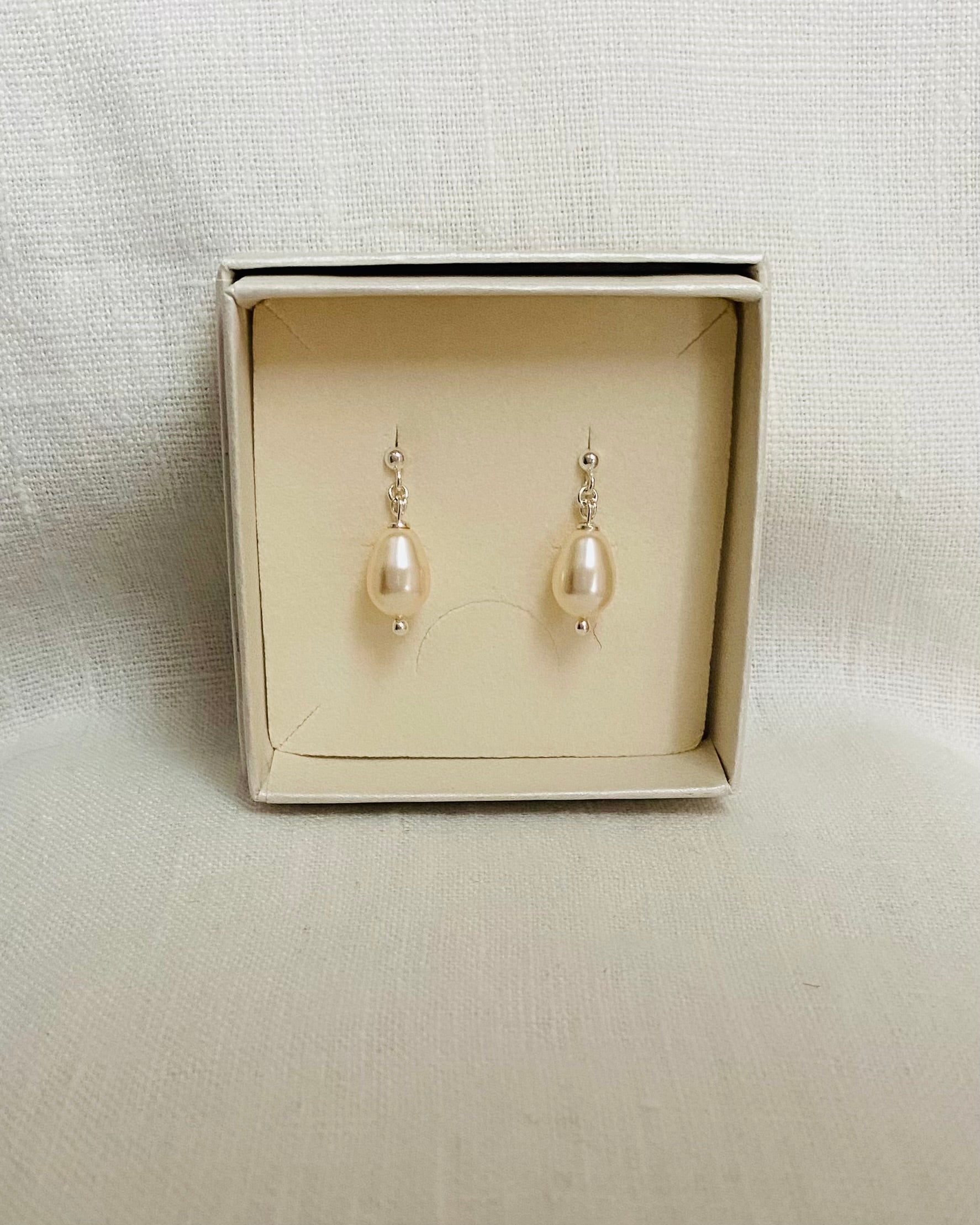 Beautiful, delicate stud earrings with a hanging drop pearl in sterling silver. The pearl in the earrings is a high-quality mother-of-pearl crystal pearl made in Austria.